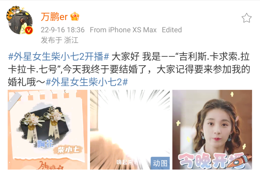 都来参加我“妹妹”的婚礼【转发】@万鹏er:#外星女生柴小七2开播# 大家好 我是——“吉利斯.卡求索.拉卡拉卡.七号”,今天我终于要结婚了,大家记得要来参加我的婚礼哦~#外星女生柴小七2#